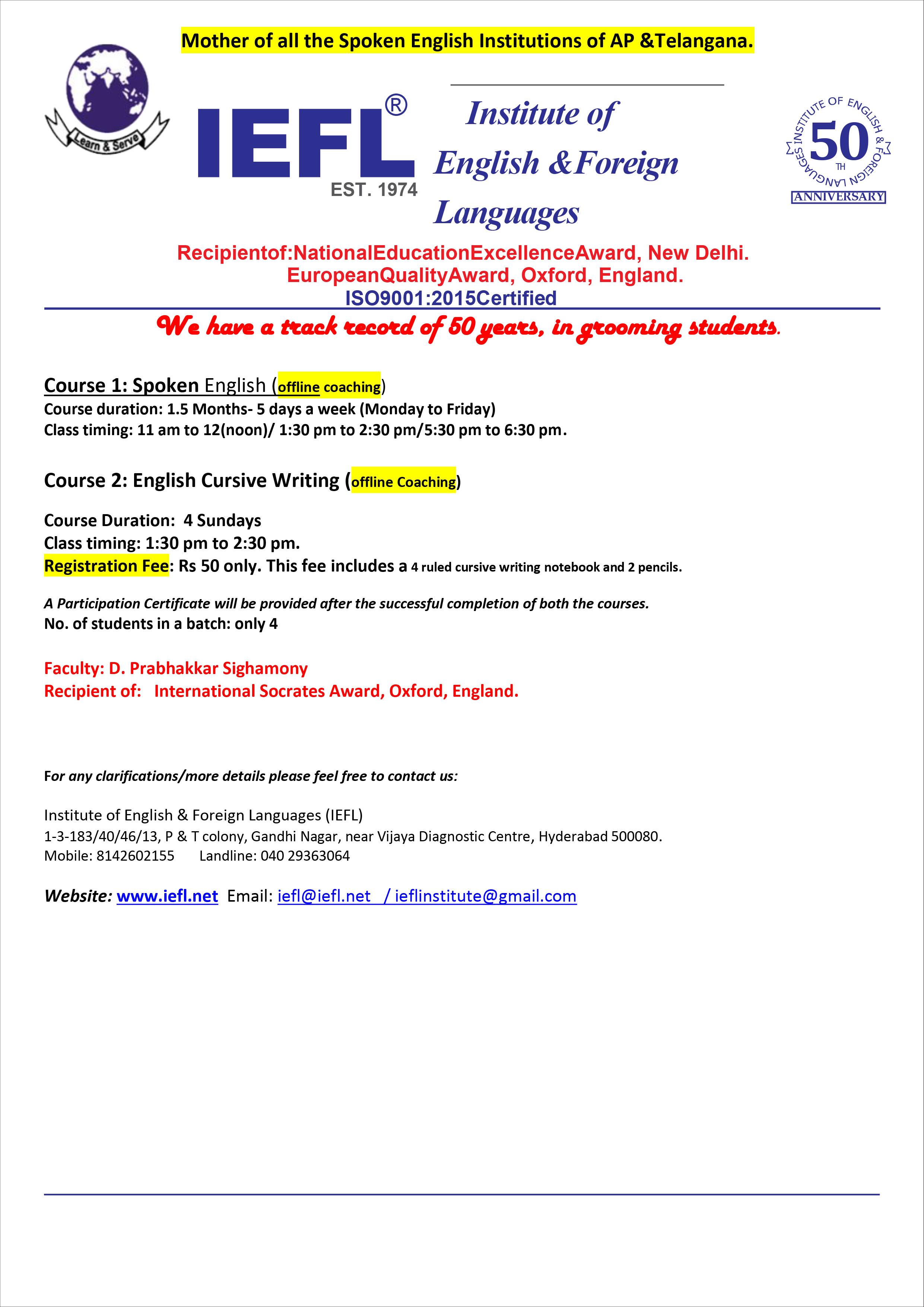The Institute of English & Foreign Languages (IEFL) was founded by Mr. David Prabhakar Sighamony in the year 1974. He had also floated Prabhu's Seva Niketan, a Social Service Centre in the year 1987; which had a Child Guidance Centre, an Immunization Clinic and an Eye Clinic. He was felicitated by our former President Dr. Shankar Dayal Sharma for being one of the highest blood donors of Telangana & AP (44 times).